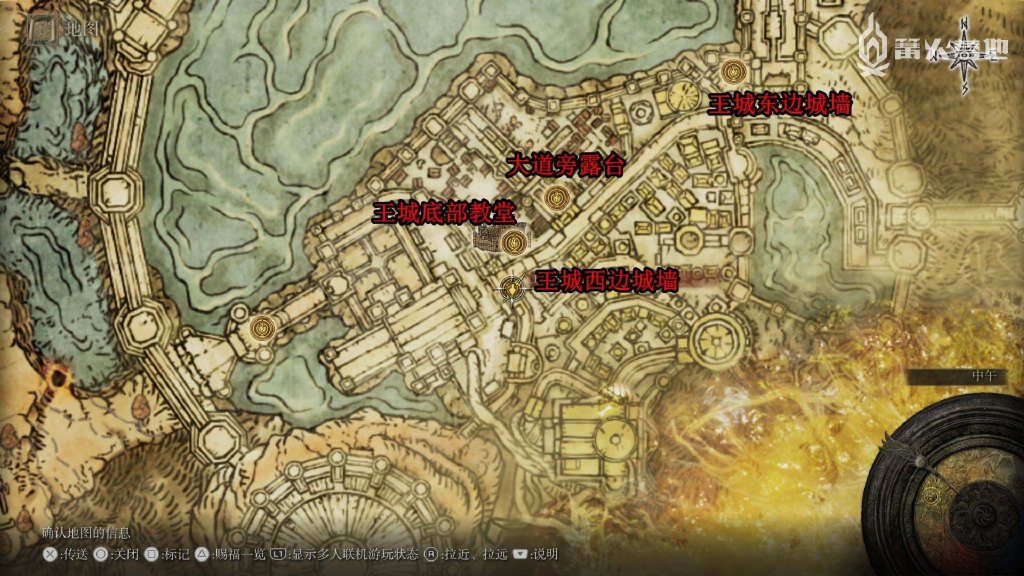 来到王城的上层赐福「王城东边城墙」,可以俯瞰整个王城。城内分为四层:城墙、城内屋顶,地面和下水道。主线的流程是从城中伫立的巨龙尸体的翅膀往上爬,来到赐福「王城西边城墙」。