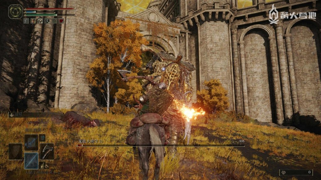 进入王城外围有两条路线可选,一条是从贴着南边那条明显的路直接进入王城外围,有两个大树守卫看着的大门,可以从左边贴着岩壁,躲避巨熊的追打,潜入绕过守卫进入大门;另一条则是从北侧途径风车村,顶着正门的两个投石机的炮火进入王城外围。但不管从什么路线进入王城外围,最后都需要从北边如图位置,击败 Boss「龙装大树守卫」才能从它背后的门进入王城中,
