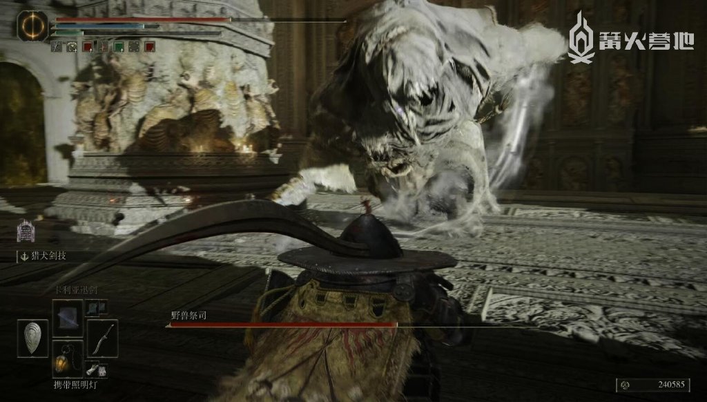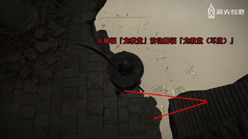 击败 Boss 后,从赐福「龙教堂祭坛」出发,经由赐福「龙教堂(屋顶)」来到赐福「大桥侧边」,不要管门口的龙装大树守卫,直接进入雾门挑战 Boss「野兽祭司」。