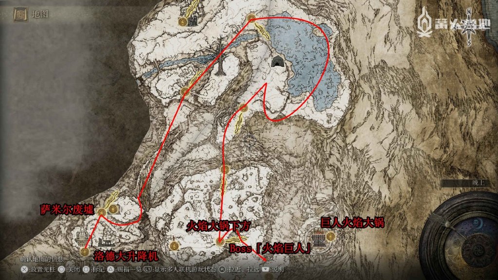 在升降机前举起符节,进入巨人山顶,沿着下图的路线跑到赐福「火焰大锅下方」,踩着链条进入东侧,击败 Boss「火焰巨人」,然后来到赐福「巨人火焰大锅」。