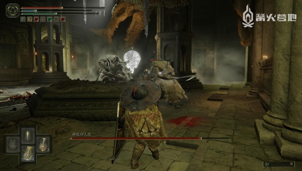 触碰赐福「巨人火焰大锅」,触发剧情,来到新区域「逐渐崩毁的法姆·亚兹拉」。我们的目标是地图东侧巨大的圆形厅堂。当来到赐福「龙教堂」后,先回头跳到下方另一边,再次回头往下跳到龙教堂赐福的下方,前进一小段距离可以来到赐福「龙教堂(耳堂)」,接着就要挑战 Boss「神皮双子组」。